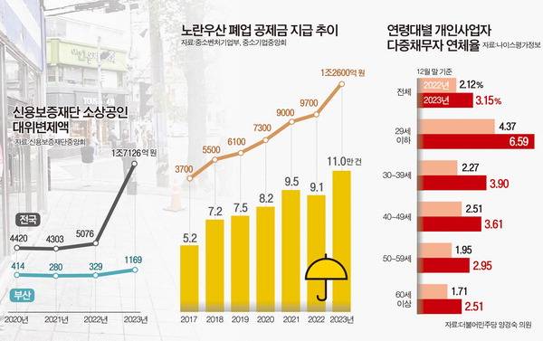 신용보증재단중앙회가 공개한 자료를 보면 지난해 부산지역 대위변제액은 1169억 원으로 전년도 329억 원과 비교해 255.32% 늘었다. 2020년 414억 원에서 2021년 280억 원으로 감소하는 듯했으나 지난해 폭증했다. 대위변제는 소기업과 소상공인이 은행에서 대출받을 수 있도록 보증해준 지역신보들이 소상공인이 상환하지 못한 대출을 대신 갚아주는 제도다.