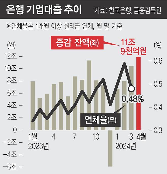 최근 들어 은행의 기업대출 증가세가 이어지고 있다. 주춤했다 다시 늘고 있는 가계대출과 달리 기업대출의 증가세는 꾸준하다. 고금리 환경이 장기화하는 가운데 상환능력이 취약한 중소기업을 중심으로 연체율도 상승 추세여서 금융회사의 건전성 우려도 짙어지고 있다.