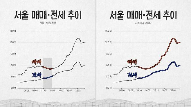 사실은 원래 전세하고 매매는 다르게 가는 게 맞아요. 왜냐하면 내가 전세를 살지, 그러니까 임차해서 살지 아니면 매매를 해서 살지를 고르는 거잖아요. 예를 들어 2010년대 초반에 매매 가격이 떨어졌어요, 서울이. 근데 당시 전세 가격은 빠르게 올랐다고요.