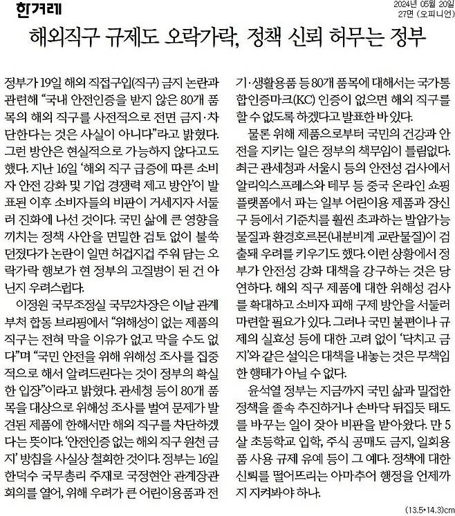 한겨레 = 해외직구 규제도 오락가락, 정책 신뢰 허무는 정부