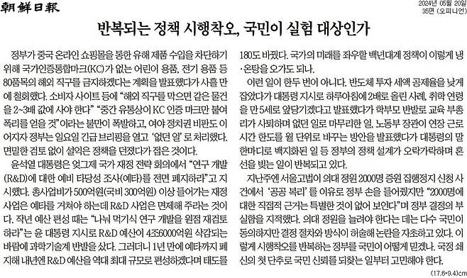 오늘(5.20) 아침 가장 큰 뉴스는 △‘국외직구 금지’ 3일만에 철회(6곳)입니다. 모든 신문이 이 기사를 1면에 실었고, 이 가운데 4곳이 톱기사로 배치했습니다. 이어 △최경주 최고령(54살) 우승(2곳, 사진 3곳) △전공의 복귀시한 임박(2곳) 등이 뒤를 이었습니다.