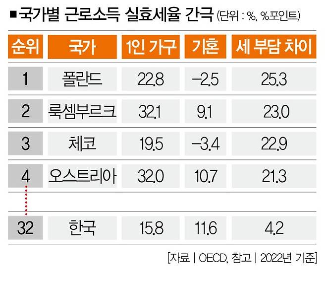 OECD는 2022년 38개국의 미혼 근로자와 기혼 근로자(자녀 2명 기준)의 소득세 실효세율(소득세+사회보장료-복리후생비) 차이를 계산해 순위를 매겼다. 세금을 비롯해 사회보장비까지 포함해 미혼 근로자와 기혼 근로자의 세 부담이 얼마나 차이가 나는지를 따져보기 위해서였다.