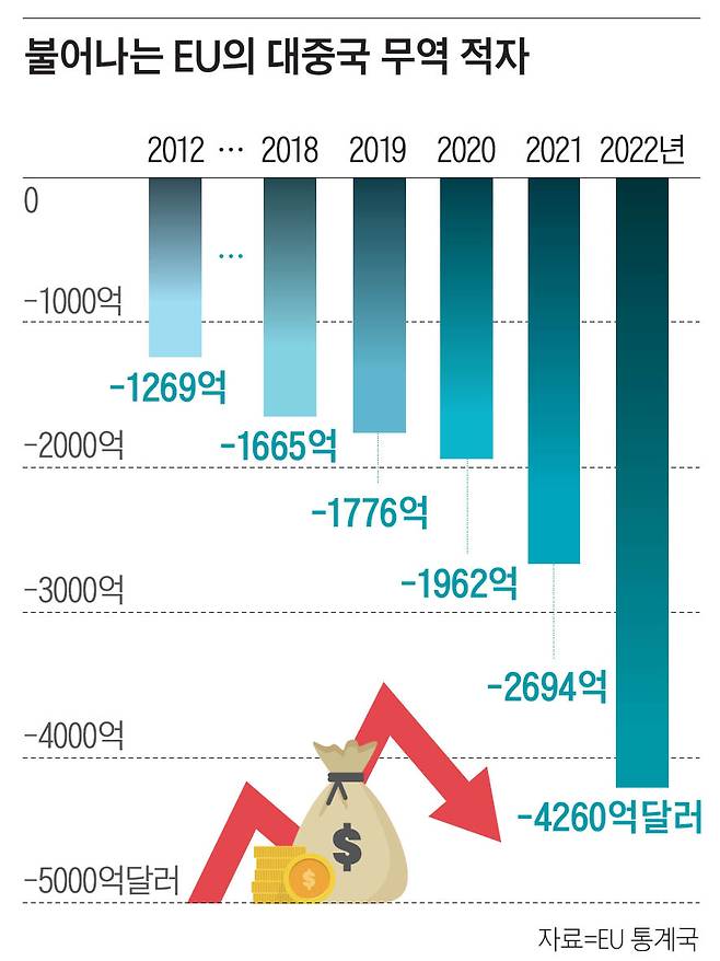 EU는 2019년 전략 보고서에서 중국을 협력 파트너이자 경제적 경쟁자, 체제 라이벌로 규정했다. 모순된 내용이 공존하는 느낌이 들 수 있다. 중국에 대한 27개 EU 회원국의 이해관계가 복잡하게 얽혀있기 때문이다. 특히 EU의 대중국 무역적자가 2022년 4260억달러(약 578조4228억원)로 갈수록 불어나고 있다.