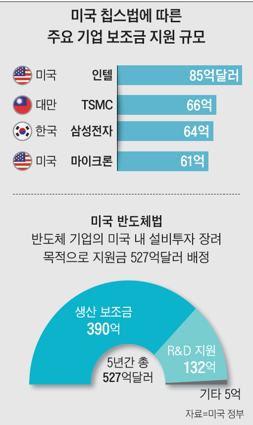 ‘반도체 공장’에 400조원 쏟아붓는 글로벌 보조금 전쟁…韓 “금융·세제 지원만”미국과 중국, 일본, 유럽연합(EU) 등이 삼성전자와 SK하이닉스, 대만 TSMC 등 반도체 시장을 주도하는 주요 기업 공장을 자국에 유치하기 위한 보조금 전쟁을 치르고 있다. 미국은 2022년 8월 도입된 ‘반도체 칩과 과학법(칩스법)’에 따라 인텔(85억달러·약 11조5400억원), TSMC(66억달러·약 8조9600억원), 삼성전자(64억달러·약 8조6800억원), 마이크론(61억달러· 약 8조2800억원)에 보조금을 지급하기로 했다. 일본은 구마모토현에 건설된 TSMC 1공장과 건설 예정인 2공장에 총투자비 40~50% 보조금을 지원한다.