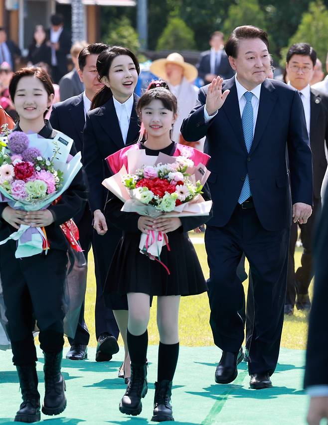 | ▲ 윤석열 대통령과 김건희 여사가 지난 19일 경기도 양주시 회암사지에서 열린 '회암사 사리 이운 기념 문화축제 및 삼대화상 다례재'에 입장하고 있다. |