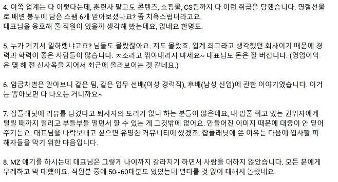 이어 "MZ 얘기를 하시는데 대표님은 그렇게 나이까지 갈라치기 하면서 사람을 대하지 않았다. 모든 분에게 무례하고 막 대했어요. 직원분 중에 50~60대분도 있었는데 별다를 것 없이 대해 놀랐다"고 덧붙였다.