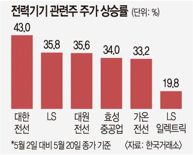 코스피 시장에서 전력 기기 관련주는 상승률 상위권에 다수 올라있다. 20일 한국거래소에 따르면 대한전선은 이달 들어 43% 올랐고, LS와 대원전선도 각각 35.8%, 35.6% 올랐다. 효성중공업(34%)과 가온전선(33.2%)도 30%대 상승률을 보였다. 올해 들어 이날까지 코스피 시장 상승률 상위 10개 종목 중 8개가 전력 기기 관련 종목이다.