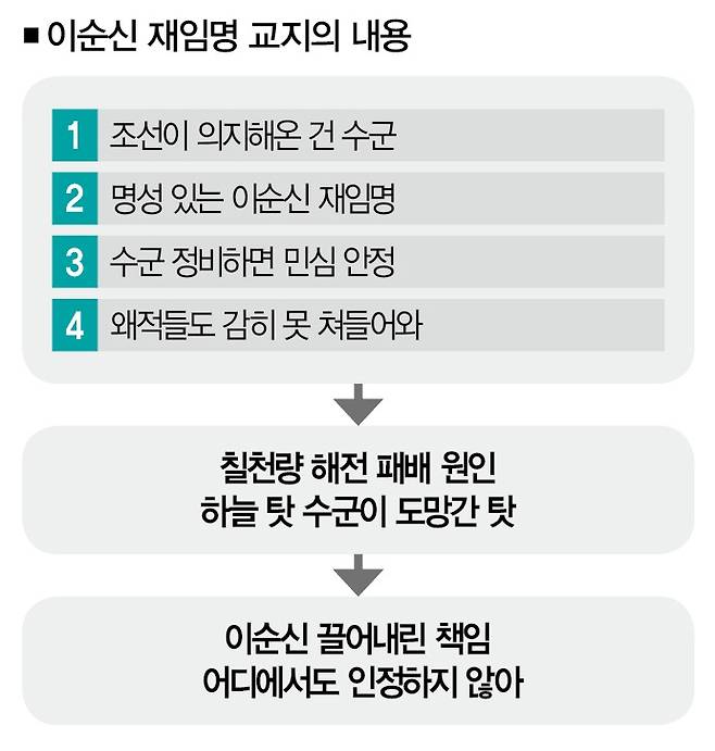 굳이 교지의 전문을 옮겨 쓴 이유가 있다. 현재의 지도자들이 성찰하고 교훈으로 삼아야 할 부분이 있기 때문이다. 선조의 교지는 약간 미안한 감은 있지만, 당신이 알아서 수군을 재건하고 민심도 되찾으라는 이야기와 다를 바 없다. 더 큰 문제는 자신의 잘못된 판단으로 수많은 군사와 백성들이 목숨을 잃고 노략질당하고 있는데도, 행간에 진정한 사과의 마음이 엿보이지 않았다는 것이다. 오히려 도망간 탓과 하늘 탓을 하고 있는데, 이런 태도는 백성들의 외면을 자초한 측면이 있다.
