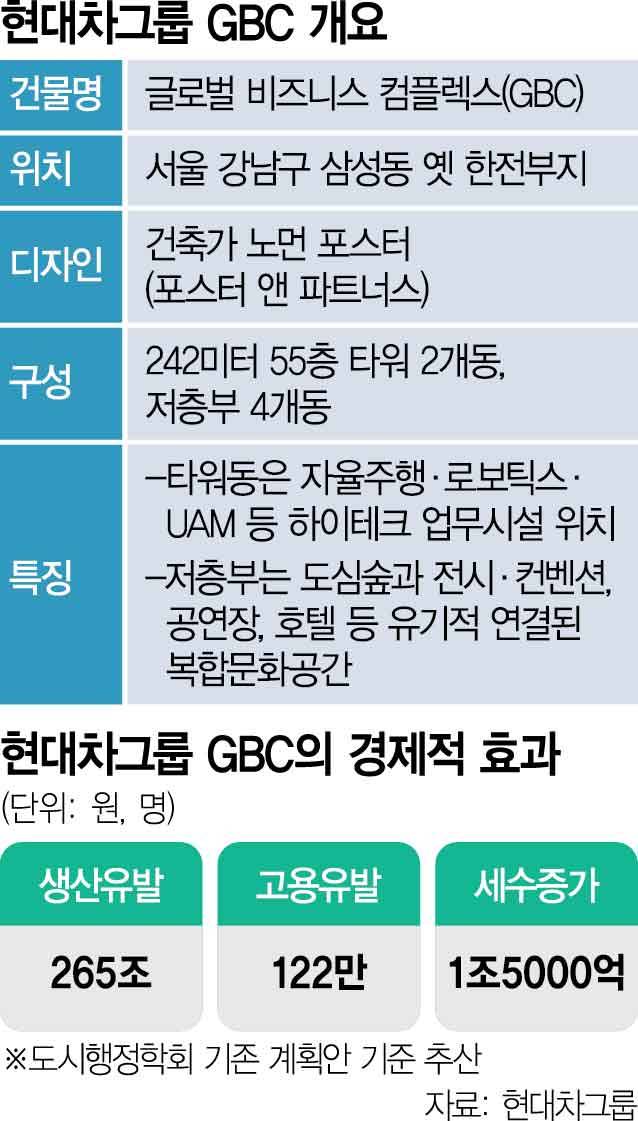 지난 2014년 서울 강남구 삼성동 옛 한국전력 부지를 매입한 현대차그룹은 105층 초고층 빌딩 1개 동과 저층 건물 4개 동을 짓겠다는 제안서를 제출하고 2016년 서울시와 사전협상을 거쳐 2020년 착공에 들어갔다. 하지만 본격적인 공사는 차일피일 미뤄졌고, 그사이 공사비 상승과 초고층 빌딩 건립에 따른 고도 제한 문제 등으로 현대차그룹은 기존 설계안에 대한 재검토 작업을 진행했다. 그 결과 현대차그룹은 GBC 건물의 실용성과 안전성, 대내외 경영환경 변화, 그룹의 미래전략 등을 종합적으로 고려해 지난 2월 서울시에 변경안을 제출했다. 당초 105층 초고층 빌딩을 지으려던 계획을 55층 2개 동으로 변경하는 것이 변경안의 뼈대다.