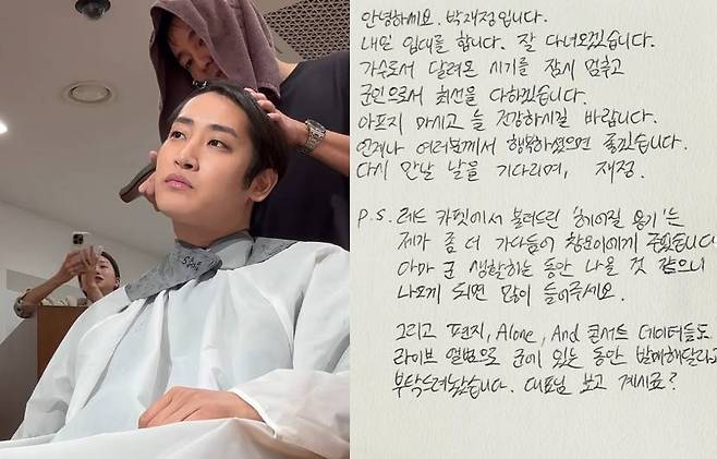 입대를 앞둔 20일, 박재정은 자신의 채널을 통해 손편지와 삭발하는 영상을 공개했다.