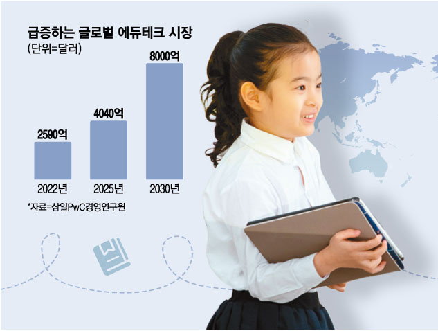 반면 전 세계 에듀테크 시장은 급격히 성장 중이다. 지난 2월 삼일PwC 경영연구원이 발표한 에듀테크 시장 분석 보고서에 따르면 전 세계 에듀테크 시장 규모는 향후 6년간 연평균 성장률 약 15%로 성장해 2030년 8000억달러(약 1068조원)에 이를 전망이다.