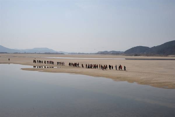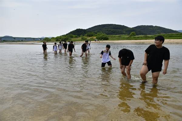 | ▲ 낙동강 물길을 걸어라. 무릎 아래 정도밖에 되지 않는 강에서 아이들이 낙동강을 온몸으로 느껴보고 있다. |