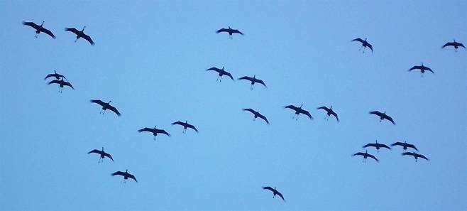 | ▲ 흑두루미들의 비행 모습. 창공에서 한참을 선회비행을 한 후 서서히 내려앉는다. |
