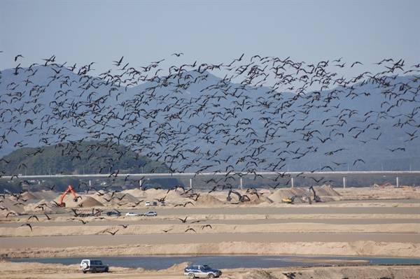 | ▲ 4대강사업 당시인 2010년 겨울의 해평습지. 4대강 삽질로 겨울철새들이 내려앉지 못하고 방황하고 있다. |