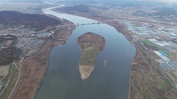| ▲ 4대강사업 후 해평습지의 모습. 가운데 섬 하중도를 중심으로 해서 물만 그득하고 그 많았던 모래톱은 하나도 보이질 않는다. 아니 어떤 생명의 흔적도 없다. 2023년의 해평습지. |