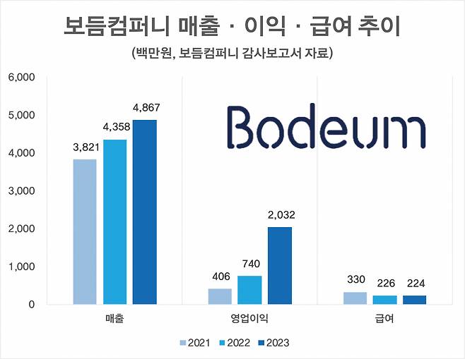 이에 반해 판관비(판매비·관리비) 명목 중 급여액은 지난해 2억2400만원으로 집계, 전년(2억2600만원)보다 되레 줄었다. 또 2년 전 급여(3억3000만원)과 비교해서는 32% 가량 줄어든 수준이다. 보듬컴퍼니의 영업이익률 상승에는 매출 대비 급여 비중이 줄어든 영향도 적지 않게 작용한 것으로 보인다.