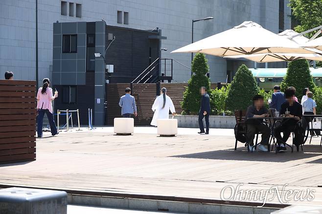 | ▲ 역술인 천공(본명 이천공)이 21일 오후 서울 광화문광장 부근에서 일행들과 함께 커피를 마신 뒤 광화문역 구내 한 도자기 작품 전시장을 방문하기 위해 이동하고 있다. |