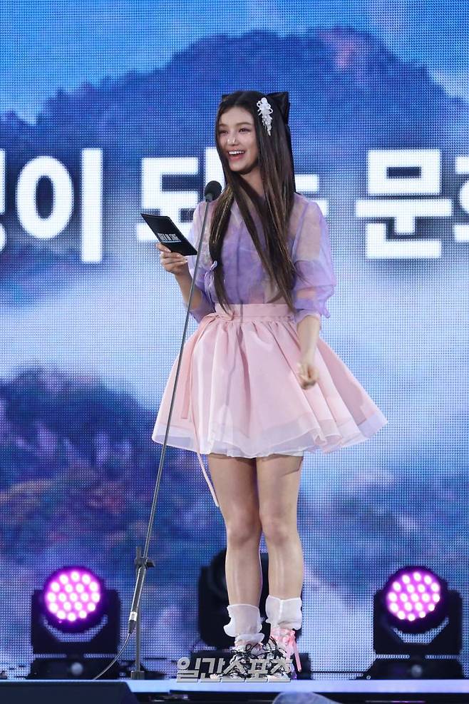 그룹 뉴진스 다니엘이 21일 오후 서울 종로구 경복궁 흥례문 광장 앞에서 열린 '코리아 온 스테이지' 공연에 참석해 단독 MC를 맡고 있다.