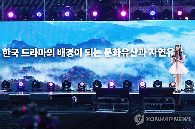 (서울=연합뉴스) 진연수 기자 = 그룹 뉴진스 다니엘이 21일 오후 서울 경복궁 흥례문 광장에서 국가유산청 출범을 기념해 열린 '2024 코리아 온 스테이지 - 뉴 제레이션' 공연에서 프레젠테이션을 하고 있다. 2024.5.21