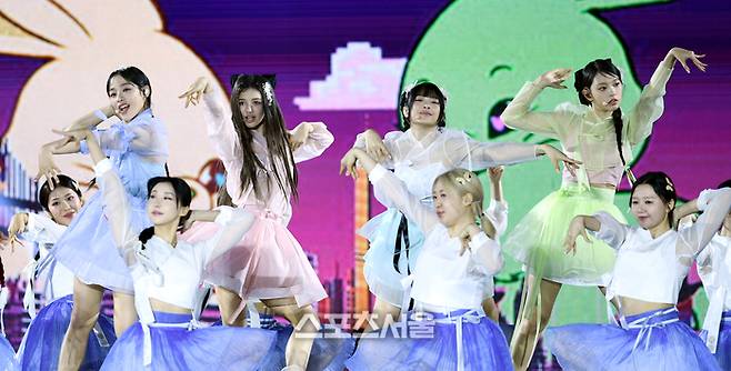뉴진스가 21일 서울 경복궁에서 열린 ‘코리아 온 스테이지’에서 공연을 하고 있다.