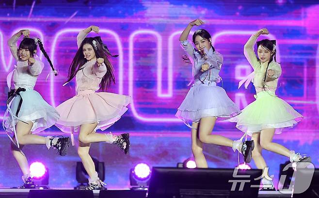 (서울=뉴스1) 김진환 기자 = 걸그룹 뉴진스가 21일 오후 서울 종로구 경복궁 흥례문 광장에서 열린 ‘2024 국가유산 방문 캠페인 : ‘코리아 온 스테이지’ 무대에서 열정적인 공연을 펼치고 있다.