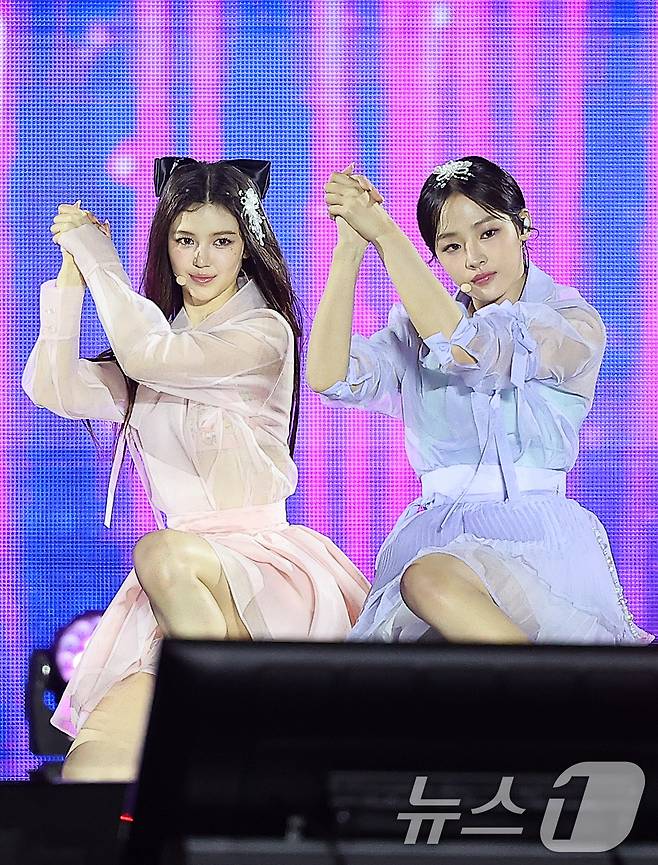 (서울=뉴스1) 김진환 기자 = 걸그룹 뉴진스 다니엘과 민지(오른쪽)가 21일 오후 서울 종로구 경복궁 흥례문 광장에서 열린 ‘2024 국가유산 방문 캠페인 : ‘코리아 온 스테이지’ 무대에서 열정적인 공연을 펼치고 있다.