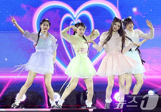 (서울=뉴스1) 김진환 기자 = 걸그룹 뉴진스가 21일 오후 서울 종로구 경복궁 흥례문 광장에서 열린 ‘2024 국가유산 방문 캠페인 : ‘코리아 온 스테이지’ 무대에서 열정적인 공연을 펼치고 있다.