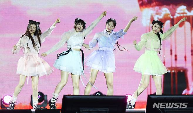 [서울=뉴시스] 김근수 기자 = 걸그룹 뉴진스가 21일 서울 종로구 경복궁에서 열린 ‘2024 국가유산 방문 캠페인 : ‘코리아 온 스테이지’ 무대에서 공연을 펼치고 있다. 2024.05.21. ks@newsis.com