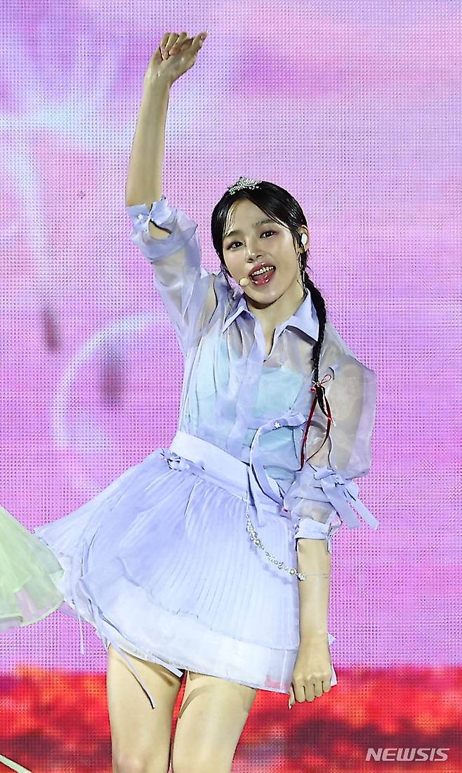 [서울=뉴시스] 김근수 기자 = 걸그룹 뉴진스 민지가 21일 서울 종로구 경복궁에서 열린 ‘2024 국가유산 방문 캠페인 : ‘코리아 온 스테이지’ 무대에서 공연을 펼치고 있다. 2024.05.21. ks@newsis.com