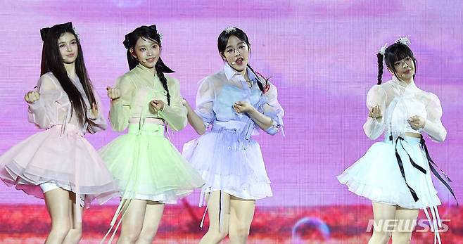 [서울=뉴시스] 김근수 기자 = 걸그룹 뉴진스가 21일 서울 종로구 경복궁에서 열린 ‘2024 국가유산 방문 캠페인 : ‘코리아 온 스테이지’ 무대에서 공연을 펼치고 있다. 2024.05.21. ks@newsis.com