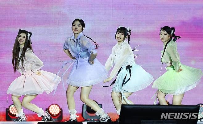 [서울=뉴시스] 김근수 기자 = 걸그룹 뉴진스가 21일 서울 종로구 경복궁에서 열린 ‘2024 국가유산 방문 캠페인 : ‘코리아 온 스테이지’ 무대에서 공연을 펼치고 있다. 2024.05.21. ks@newsis.com