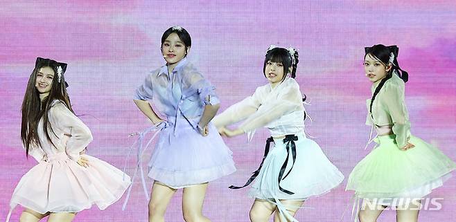[서울=뉴시스] 김근수 기자 = 걸그룹 뉴진스가 21일 서울 종로구 경복궁에서 열린 ‘2024 국가유산 방문 캠페인 : ‘코리아 온 스테이지’ 무대에서 공연을 펼치고 있다. 2024.05.21. ks@newsis.com