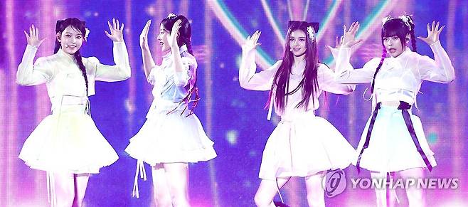 (서울=연합뉴스) 진연수 기자 = 그룹 뉴진스가 21일 오후 서울 경복궁 흥례문 광장에서 국가유산청 출범을 기념해 열린 '2024 코리아 온 스테이지 - 뉴 제레이션' 공연에서 무대를 선보이고 있다. 2024.5.21
