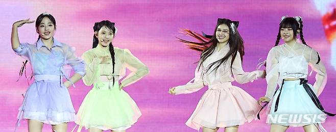 [서울=뉴시스] 김근수 기자 = 걸그룹 뉴진스가 21일 서울 종로구 경복궁에서 열린 ‘2024 국가유산 방문 캠페인 : ‘코리아 온 스테이지’ 무대에서 공연을 펼치고 있다. 2024.05.21. ks@newsis.com