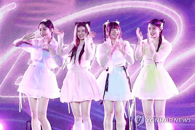 (서울=연합뉴스) 진연수 기자 = 그룹 뉴진스가 21일 오후 서울 경복궁 흥례문 광장에서 국가유산청 출범을 기념해 열린 '2024 코리아 온 스테이지 - 뉴 제레이션' 공연에서 무대를 선보이고 있다. 2024.5.21