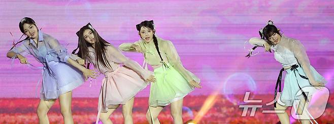 (서울=뉴스1) 김진환 기자 = 걸그룹 뉴진스가 21일 오후 서울 종로구 경복궁 흥례문 광장에서 열린 ‘2024 국가유산 방문 캠페인 : ‘코리아 온 스테이지’ 무대에서 열정적인 공연을 펼치고 있다.