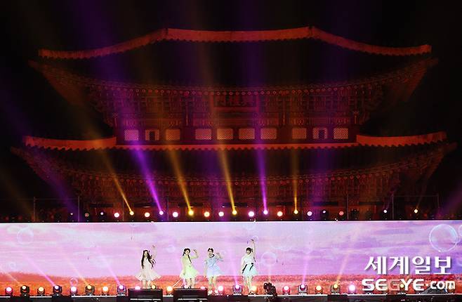 국가유산청이 주최하고 국가유산진흥원과 KBS한국방송이 주관하는 '2024 코리아 온 스테이지-뉴 제너레이션'(이하 '코리아 온 스테이지')이 21일 오후 서울 종로구 경복궁 흥례문 앞 특설무대에서 개최됐다. 그룹 뉴진스가 축하 무대를 펼치고 있다.