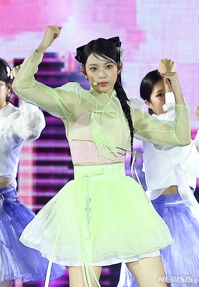 [서울=뉴시스] 김근수 기자 = 걸그룹 뉴진스 해린이 21일 서울 종로구 경복궁에서 열린 ‘2024 국가유산 방문 캠페인 : ‘코리아 온 스테이지’ 무대에서 공연을 펼치고 있다. 2024.05.21. ks@newsis.com