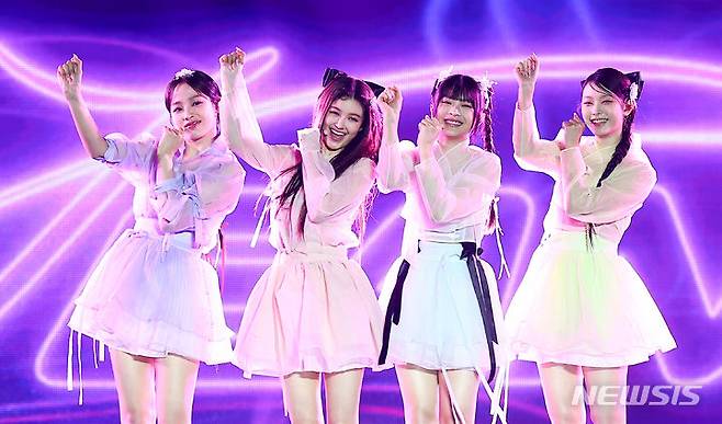 [서울=뉴시스] 김근수 기자 = 걸그룹 뉴진스가 21일 서울 종로구 경복궁에서 열린 ‘2024 국가유산 방문 캠페인 : ‘코리아 온 스테이지’ 무대에서 공연을 펼치고 있다. 2024.05.21. ks@newsis.com