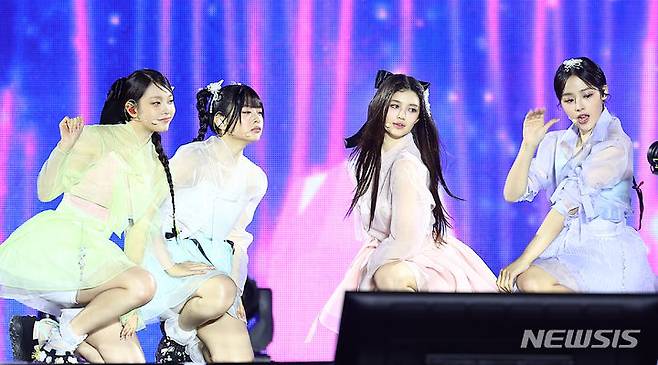 [서울=뉴시스] 김근수 기자 = 걸그룹 뉴진스가 21일 서울 종로구 경복궁에서 열린 ‘2024 국가유산 방문 캠페인 : ‘코리아 온 스테이지’ 무대에서 공연을 펼치고 있다. 2024.05.21. ks@newsis.com