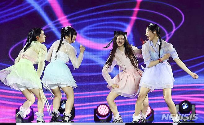 [서울=뉴시스] 김근수 기자 = 걸그룹 뉴진스가 21일 서울 종로구 경복궁에서 열린 ‘2024 국가유산 방문 캠페인 : ‘코리아 온 스테이지’ 무대에서 공연을 펼치고 있다. 2024.05.21. ks@newsis.com