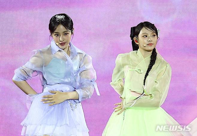 [서울=뉴시스] 김근수 기자 = 걸그룹 뉴진스 민지와 해린이 21일 서울 종로구 경복궁에서 열린 ‘2024 국가유산 방문 캠페인 : ‘코리아 온 스테이지’ 무대에서 공연을 펼치고 있다. 2024.05.21. ks@newsis.com