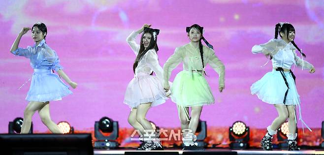 뉴진스가 21일 서울 경복궁에서 열린 ‘코리아 온 스테이지’에서 공연을 하고 있다.