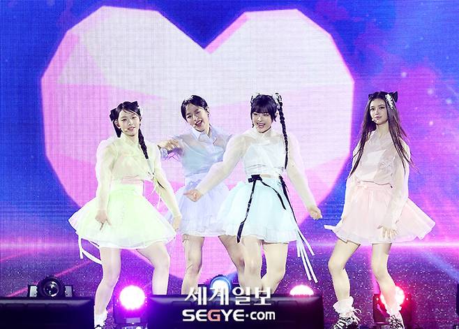 국가유산청이 주최하고 국가유산진흥원과 KBS한국방송이 주관하는 '2024 코리아 온 스테이지-뉴 제너레이션'(이하 '코리아 온 스테이지')이 21일 오후 서울 종로구 경복궁 흥례문 앞 특설무대에서 개최됐다. 그룹 뉴진스가 축하 무대를 펼치고 있다.