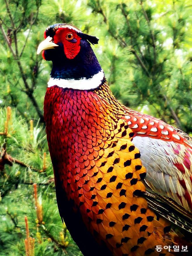 동상이냐고요? 진짜 수꿩(장끼)이랍니다. 가까이서 보니 그 위용이 장군 저리 가라 할 수준이네요.