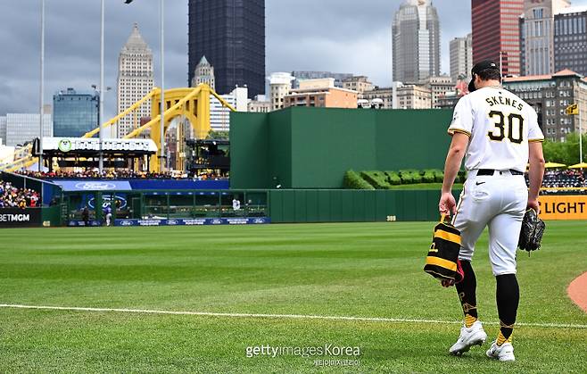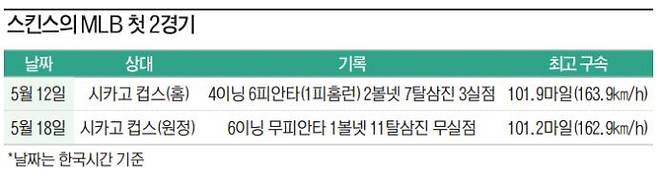 루이지애나주립대 출신 스킨스는 지난해 신인 드래프트 전체 1순위로 지명된 초특급 유망주다. 탄탄한 체격(키 1m98㎝·몸무게 106㎏)에서 나오는 160㎞/h 강속구를 앞세워 아마추어 시절부터 높은 평가를 받았다. 철저한 관리 속에 마이너리그 12경기(2023년 5경기, 2023년 7경기)만 소화하고 지난 12일 MLB에 콜업, 스타성을 입증했다. 시카고 컵스를 상대한 MLB 데뷔전에서 스킨스는 100마일(160.9㎞/h) 이상 투구를 17차례나 해냈다. 지난 18일 성사된 두 번째 등판 역시 컵스전. 결과는 6이닝 노히트 노런이었다. 그뿐만 아니라 1회 말 시작부터 팀 기록인 7타자 연속 포함, 삼진을 11개(볼넷 1개)나 잡아내며 타자를 압도했다.