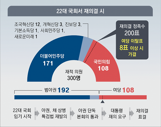 특검법이 재의결되려면 재적 의원 과반 출석에 3분의 2 이상 찬성이 필요하다. 구속 수감된 무소속 윤관석 의원을 제외한 의원 295명이 모두 본회의에 참석할 경우 197명 이상의 찬성표가 필요하다. 민주당을 포함한 범야권 의석수는 180석, 국민의힘 등 범여권은 115석이다. 국민의힘 의원 중 17명이 이탈하면 대통령의 거부권이 무력화되는 것이다.