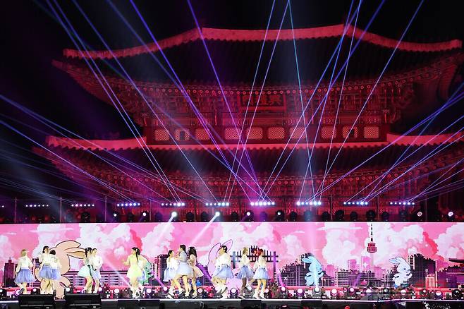 그룹 뉴진스가 21일 서울 종로구 경복궁 흥례문에서 진행된 '2024 코리아 온 스테이지-뉴 제너레이션'(이하 '코리아 온 스테이지')에서 멋진 무대를 선보이고 있다.
