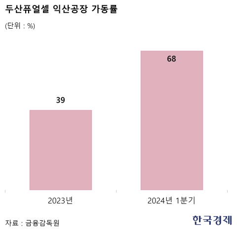 재고가 기록적인 수준인데도 두산퓨얼셀은 생산공장 가동률을 지난해보다 높였다. 올 1분기 두산퓨얼셀의 익산공장 가동률은 68%로 지난해 연간 가동률(38%)의 약 두 배가 됐다.