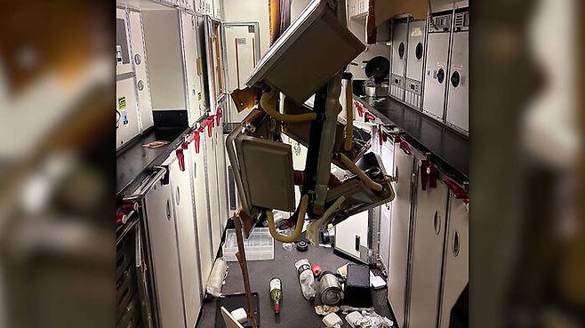 비상용 산소마스크가 주렁주렁 천장에 매달려 있고, 바닥에는 음식과 수하물을 비롯한 온갖 물건이 쏟아졌습니다.